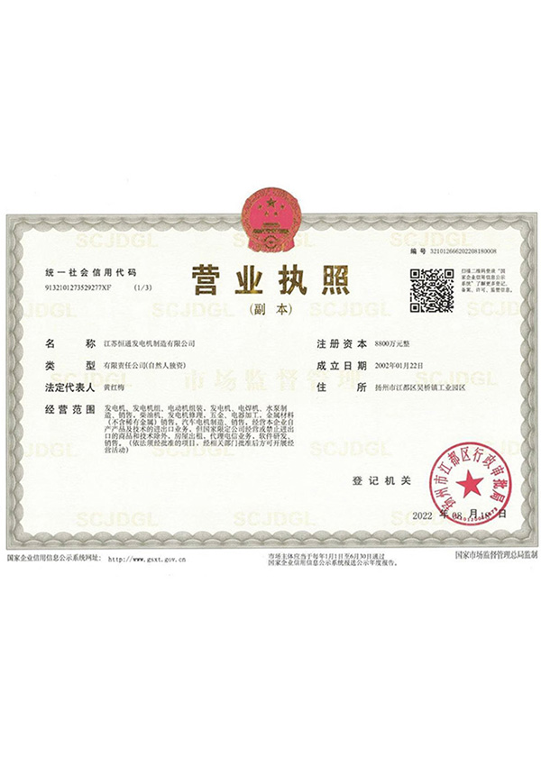 Honorary Qualification of Hengtong Generator